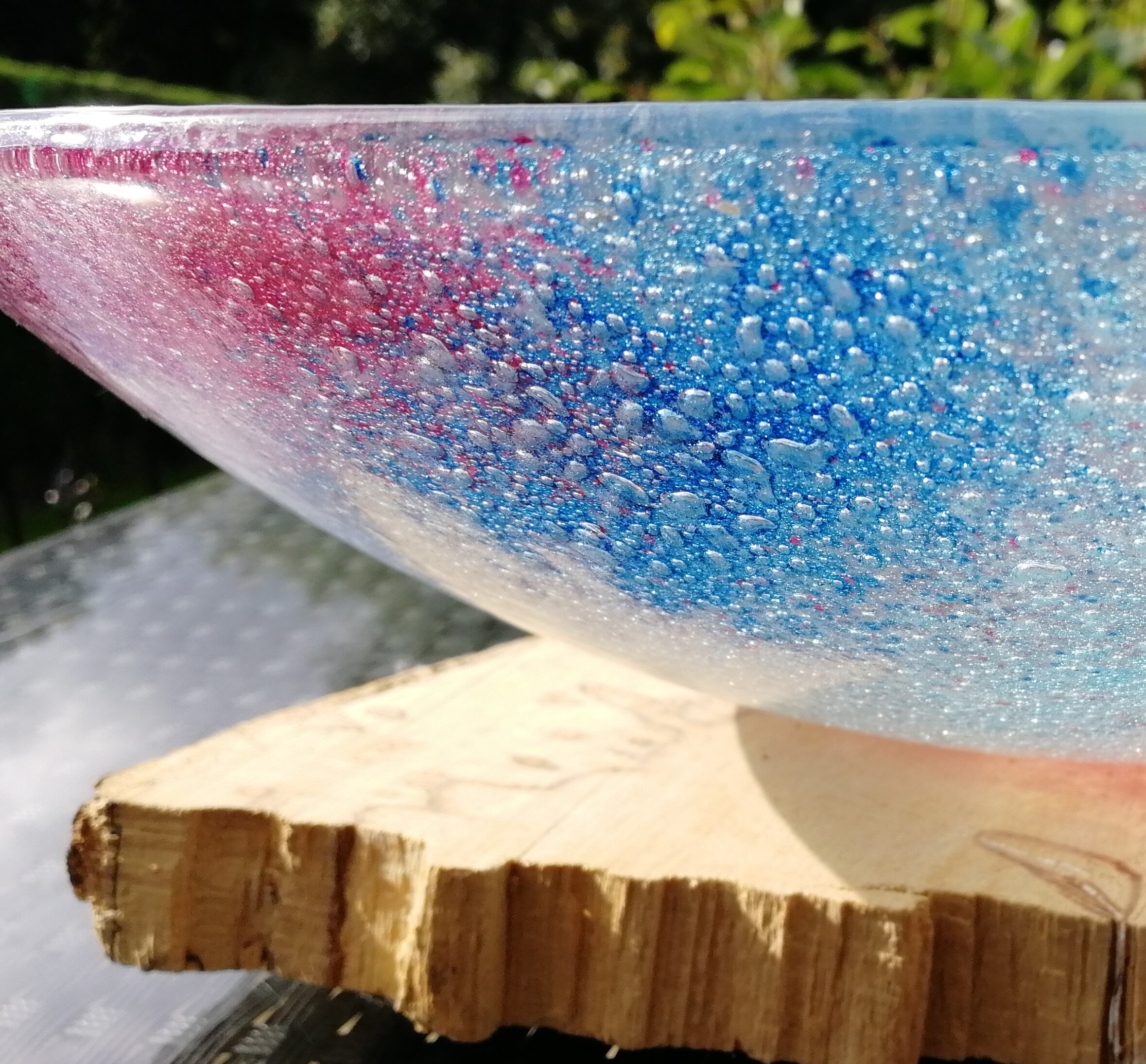 Standing at about 12cm tall and 44cm diameter, layers of glass and colour are fused together using a process that traps tiny bubbles in the layers that give a stunning impact.